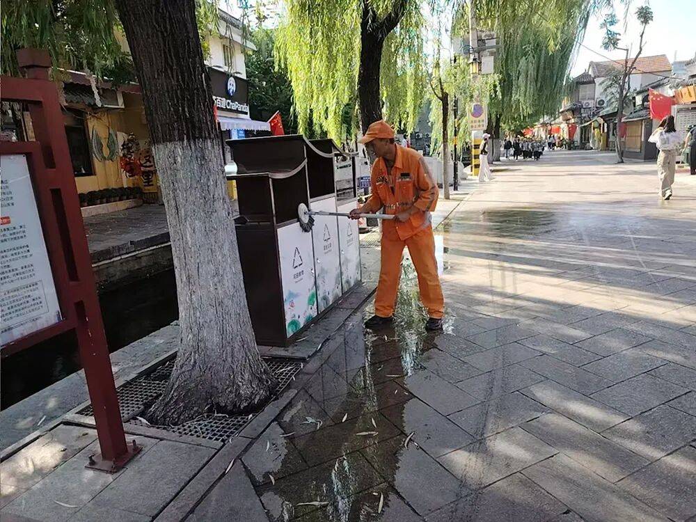 历下区保洁员在重点 一湖一环、千佛山、天下第一泉景区开展道路保洁、垃圾清运、公厕保洁,为市民游客提供干净整洁的环境。