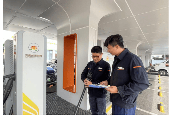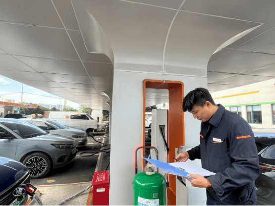 10月1日,国庆假期第一天,在济南能源黄岗超充驿站,孙凯与场站工作人员对场内充电设备、消防设施进行安全检查,巡视设备运行情况,以“远程监测 + 现场巡查” 的双重模式,守护场站运转,为广大车主做好保驾护航。