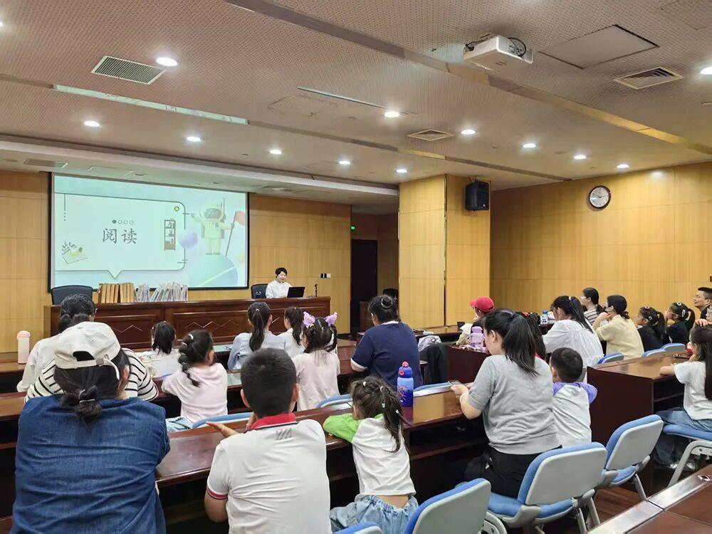 济南市图书馆中心馆负一层小报告厅,工作人员正在布置会场。一会儿“数字济图·儿童中文分级阅读训练营”活动将在这里举行。活动10点正式开始,已有家长和孩子来到这里。