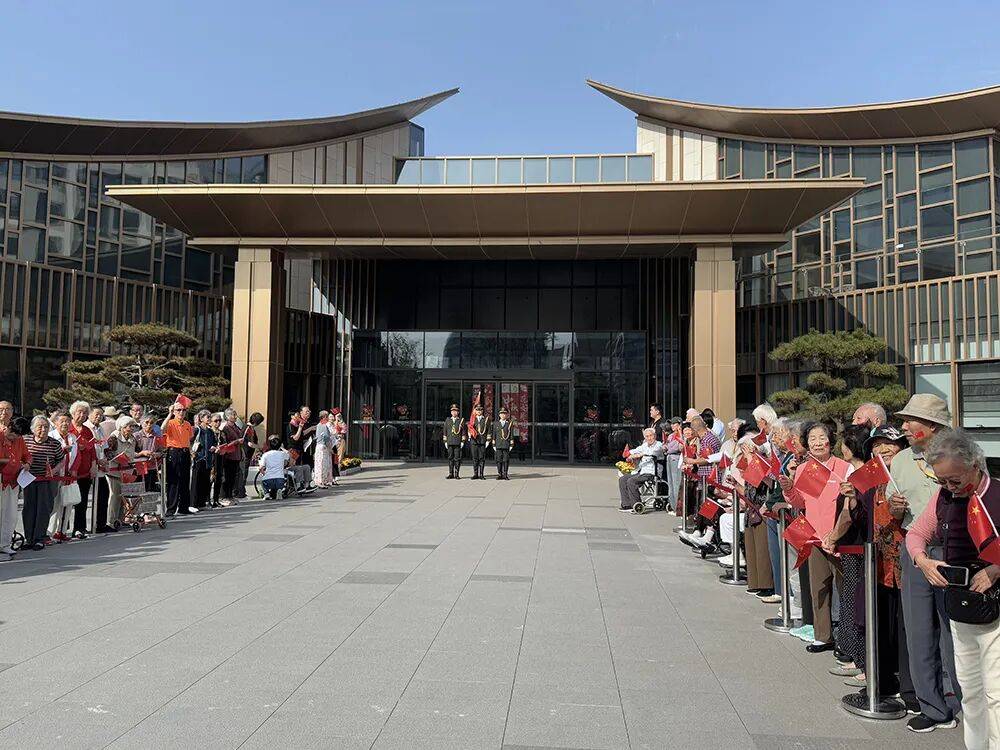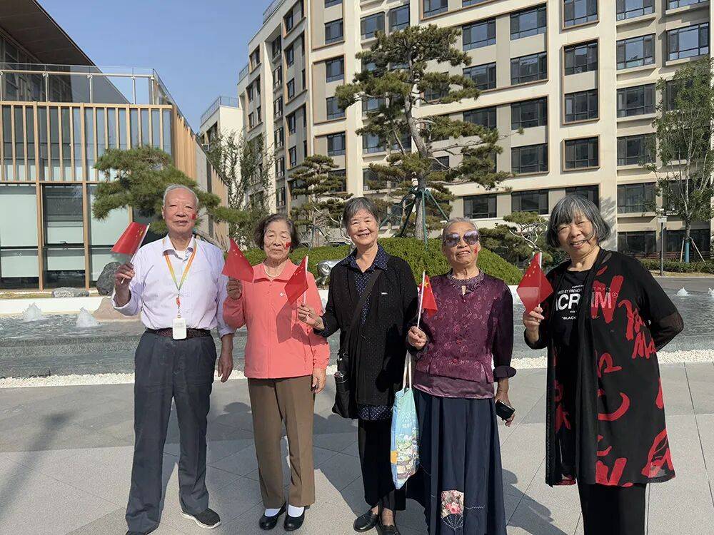 国歌奏响,五星红旗冉冉升起,长辈们肃立行注目礼,神情崇敬。随后,《歌唱祖国》旋律响起,长辈们以洪亮且饱含情感的歌声共同演唱,歌声回荡在园区上空,传递出对祖国的热爱与祝福,在演唱过程中轻轻挥动手中的小国旗,现场氛围热烈而感人。
