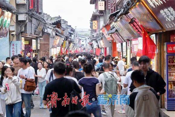济南芙蓉街迎来客流高峰,街巷内人流涌动,浓郁的节日气息伴着老城烟火气扑面而来。全国各地的游客纷至沓来,街内摩肩接踵,往来人群或等候美食,或驻足观赏,热闹非凡。