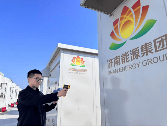 10月1日,国庆假期第一天,在济南能源鹊山储能电站,张哲雨正在对电池舱及pcs舱进行日常巡检,测量温度确保设备正常安全运行。