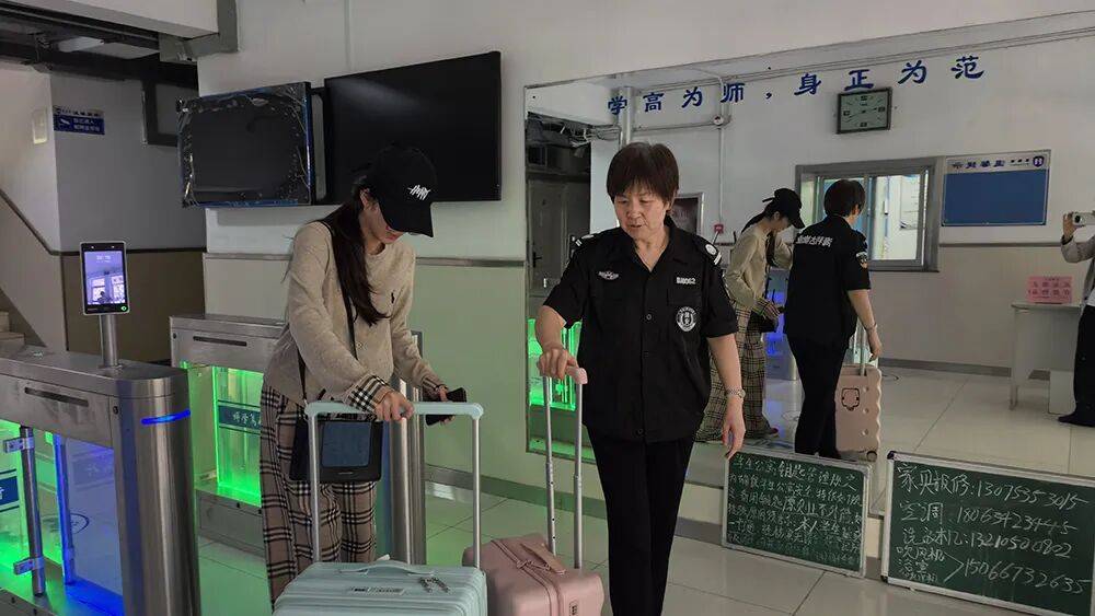 10月1日上午,走进山东师范大学千佛山校区,假期里校园少了些热闹,古朴的校园更显典雅。来到公寓1号楼,值班员孟凡霞帮着国庆节回家的学生们开门、拿行李。