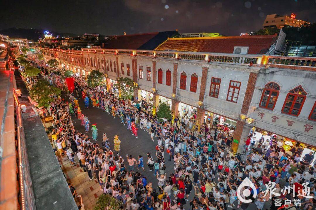 “泉州闽南文化戏剧周”系列活动之“闽南武魂·宋江阵再现”10月1日晚亮相泉州中山路,潮汕英歌舞与泉州宋江阵联袂献演。(泉州晚报社融媒体记者 陈起拓 摄)