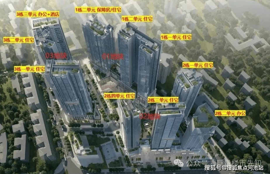 本期先推出的是01 地块,靠近深大校区。01地块规划总建面约17万㎡(住宅建面约8.9万㎡,商业建面约3.2万),容积率达9.0。由2栋(1栋1、2单元)53层、1栋(1栋3单元)43层的超高层塔楼和1栋幼儿园组成。