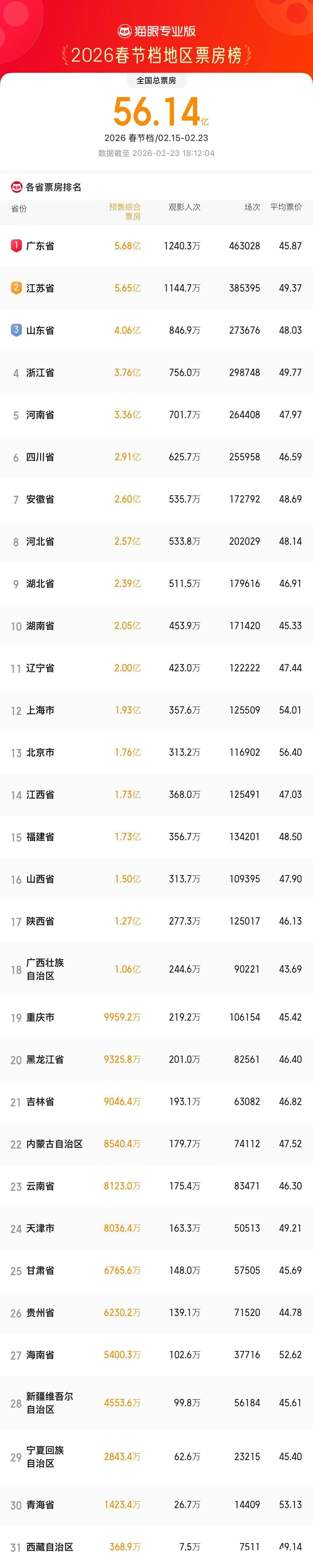 数据显示,截至2月23日18时,广东春节档票房突破5.68亿元,自2021年后重返第一,自大年初四起日票房保持第一。全省放映场次达46.3万场,吸引超1240.3万人次观影,双双领跑全国;平均票价45.87元,低于全国水平,“低价惠民”策略有效撬动了下沉市场消费潜力。