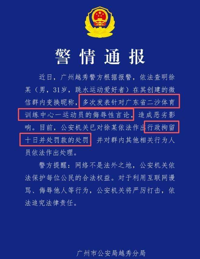 徐某今年三十一岁,本身也是跳水爱好者,说白了就是看不惯别人好,便拉着一群想法相同的人成群辱骂。为了躲避警方追查,他们天天换群名、换昵称,以为能避开法律的眼睛。殊不知,天网恢恢,疏而不漏。 处罚结果也已经明白:徐某因多次发布侮辱性言论造成恶劣影响,依法行政拘留十天并罚款,实至名归。群里那两百多名参与者,也都被警方逐一捋清,按情节轻重处理,绝无遗漏。群成员构成复杂,大多是极端体育迷,还有一些是其他运动员的粉丝,借机凑热闹泼脏水。更有少数是跳水圈从业者,利用身份恶意抹黑全红婵,试图影响她的训练和比赛。目前这些人也都被依法处理,后续还将被行业通报批评,基本失去了在行业内继续工作的资格。事态闹得这么大,不止全红婵受委屈,她的队友陈芋汐也跟着躺枪。