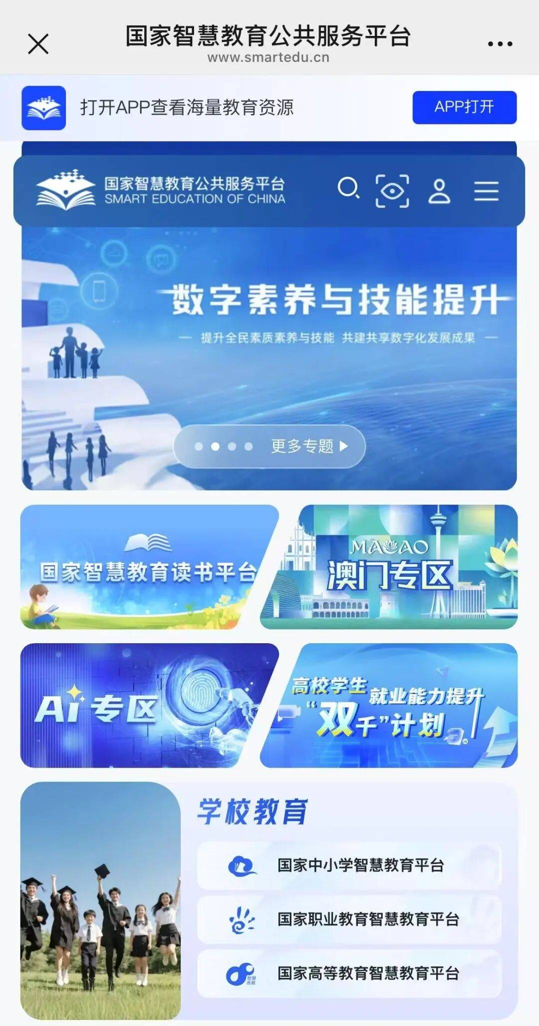 “人人皆学、处处能学、时时可学”为理念,整合多板块资源,无论是学生、教师、家长,还是社会学习者,都能找到专属自己的学习与服务入口。1.