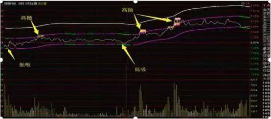 股价开盘低开-1%,股价接近指标下轨线,可在此时选择低吸,随后,股价快速冲高,并在接近上轨的时候,出现了回落的迹象,这时,则可快速选择高抛,获利了结。