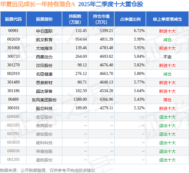 根据2025基金半年报公募基金重仓股数据,重仓该股的公募基金共2家,其中持有数量最多的公募基金为华夏基金的华夏远见成长一年持有混合A。华夏远见成长一年持有混合A目前规模为6.22亿元,最新净值1.3212(10月13日),较上一交易日下跌0.57%,近一年上涨73.02%。该公募基金现任基金经理为钟帅。钟帅在任的基金产品包括:华夏行业景气混合A,管理时间为2020年7月28日至今,期间收益率为181.45%;华夏招鑫鸿瑞混合A,管理时间为2024年1月16日至今,期间收益率为102.34%;华夏卓越成长混合A,管理时间为2025年8月12日至今,期间收益率为13.73%。