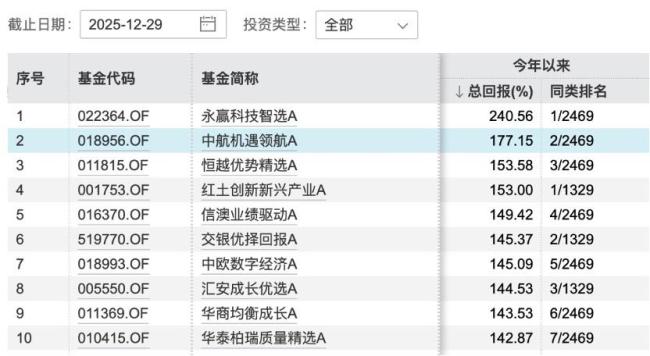 2025-12-31多宝体育,多宝体育官方网站,多宝体育APP下载2025年公募基金冠军基已无悬念。截至12月29日,任桀管理的永赢科技智选最新回报率为240.56%,领先第二名中航机遇领航63个百分点,优势明显。另一个悬念是,永赢科技智选能否打破王亚伟在2007年创造的年度收益率纪录。当年,王亚伟管理的华夏大盘精选以226.24%的收益率成为国内公募基金年度收益率的神线年间,无人能挑战这一纪录,更没有出现“两倍基”。