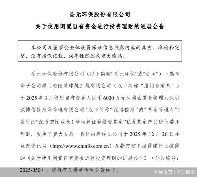 据悉,圣元环保下属全资子公司厦门金陵基建筑工程有限公司(以下简称厦门金陵基)于2025年3月使用自有资金6000万元认购由基金管理人深圳深博信投投资管理有限公司(以下简称深博信投或基金管理人)发行的深博宏图成长1号私募证券投资基金私募基金产品进行委托理财,发生了重大亏损。截至2025年12月25日,基金最新单位净值为0.1846,累计净值增长率为-81.54%,亏损金额约4692万元。