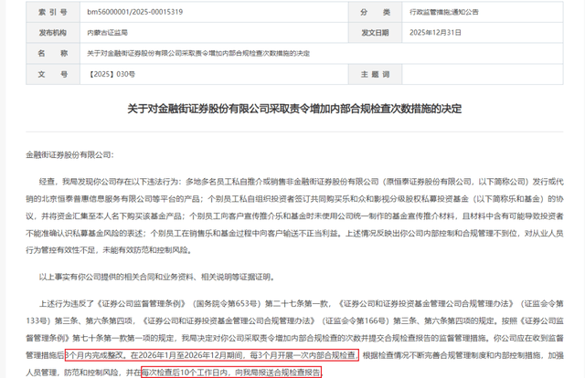 2025年9月末,金融街证券全资投行子公司恒泰长财证券因未能防范债券募集资金挪用风险,被安徽证监局出具警示函。
