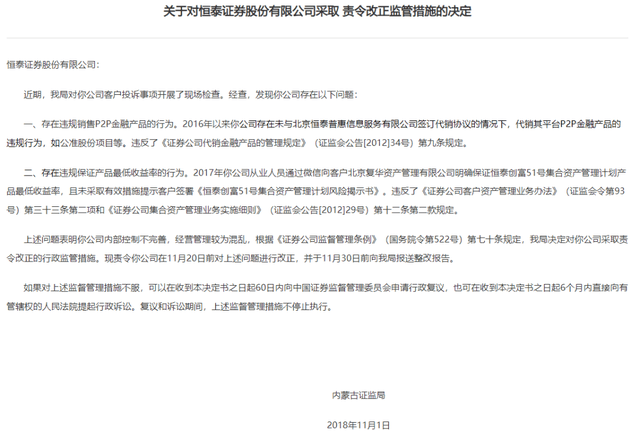 早在2018年,曾隶属于“明天系”金融版图的恒泰证券,就因未与恒泰普惠签订代销协议而代销其P2P产品被内蒙古证监局处罚,明确违反《证券公司代销金融产品管理规定》第九条。此次多名员工的违规行为是历史违规的延续,同样也缺乏合法代销授权。