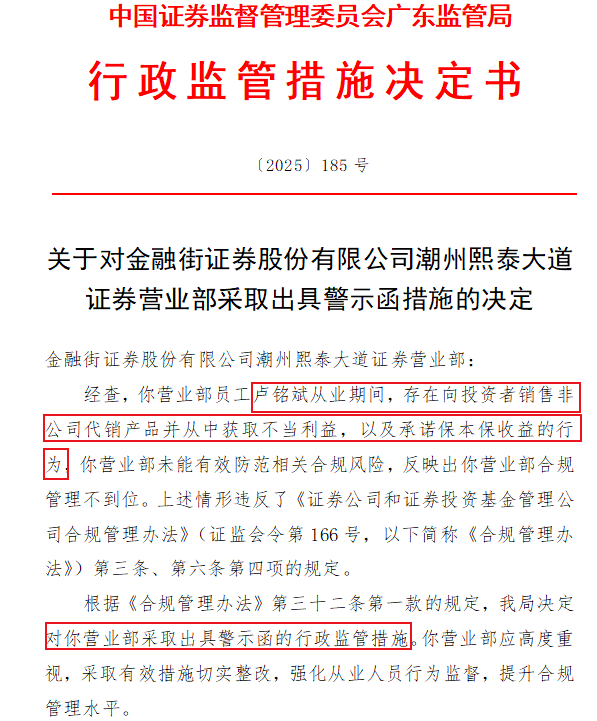 广东证监局披露,潮州熙泰大道证券营业部员工卢铭斌在从业期间,擅自向投资者销售非公司代销的产品,并从中获取不当利益,同时存在违规承诺保本保收益的行为。