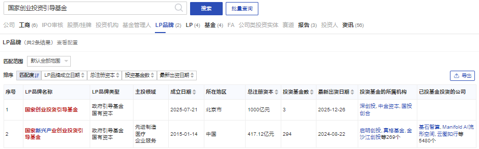 在烯牛数据搜索页面,搜索关键词(国家创业投资引导基金),可查看相关投资机构、基金信息。